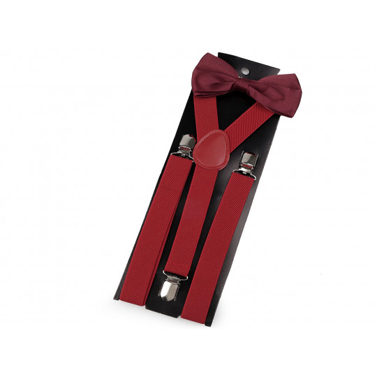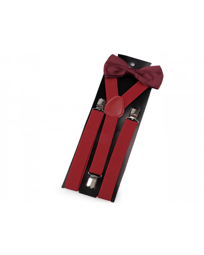 Spoločenská sada farebne zladeného motýlika a trakov poteší každého muža. Využije ju na tanečný, na svadbu a iné spoločenské udalosti. Saténový motýlik je klasikou medzi spoločenskými módnymi doplnkami. Najdlhšia dĺžka motýlika okolo krku je 49 cm. Táto dĺžka sa dá skrátiť na potrebnú veľkosť, aby motýlik presne sedel. Vzadu má zapínaciu sponu. Jeho rozmery sú 6 x 12 cm. Motýlik č.5 je trochu väčší, meria 7 x 12 cm. Jednofarebné traky sú z elastického materiálu. Umožňujú pohodlné nosenie. Zadná vsadka z eko kože im dodáva štýlový vzhľad. K nohaviciam sa upevňujú na tri žabky - dve vpredu a jednu vzadu. Sú typu Y, široké 2,5 cm, dlhé 100 cm. Sada č.1 má motýlika vo farbe bordó, traky sú červené.