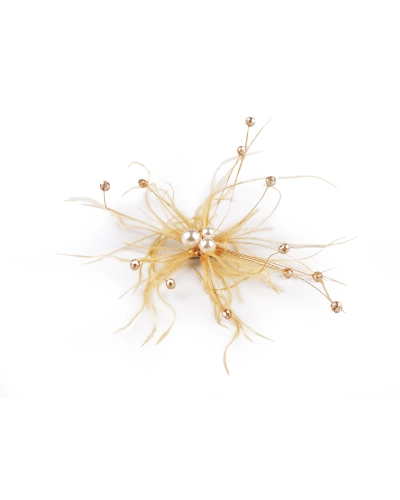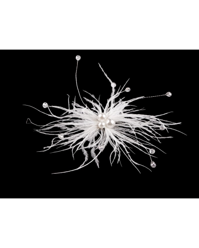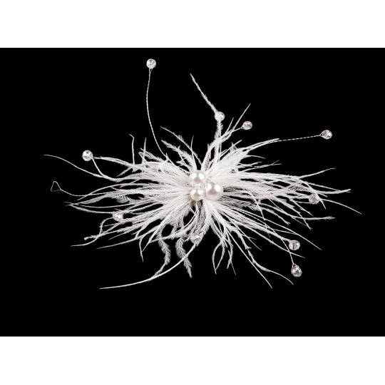 Veľká elegantná brošňa je ozdobená perlami, brúsenými korálkami a nadýchaným pštrosím perím. Je úplne úchvatná , navodzuje dojem rozviateho strapatého kvetu či snehovej vločky. Vďaka drôtikom ju môžete ľubovoľne tvarovať . Môžete ju nosiť na odevoch, klobúkoch, kabelkách či s ňou môžete zopnúť šatku. Na zadnej strane má brošňový špendlík.